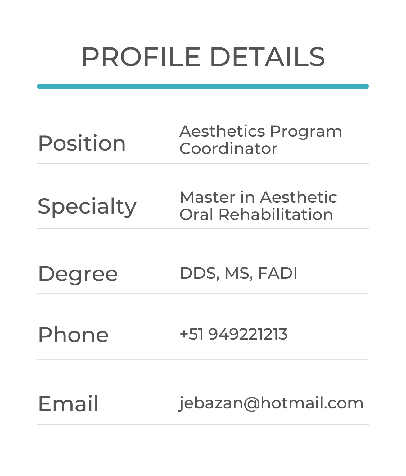 - Past Professor of the Prosthodontics Department, Faculty of Dentistry, Nacional Mayor de San Marcos University.
